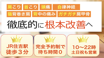 PR 住吉で開院18年目、延べ20万件以上の症例実績があります。 子供からお年寄り、学生からプロスポーツ選手まで様々な症状に対応いたします。 健康保険施術+自費施術(予約制)お選び出来ます。 平日は国家資格者による自費施術もあります。 日曜日は女性施術者(セラピスト)が院貸切りで施術します。